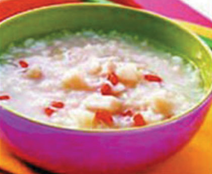 2. 将上述物料同放入钢煲或砂煲内,加水适量,大火煮滚后改用小火慢煮约1个小时至粥成为止。