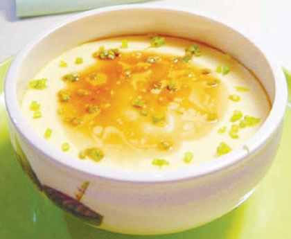 3. 锅内加水适量,将蛋碗坐于水中,大火煮滚后,改用中火将鸡蛋液炖煮成羹即成。